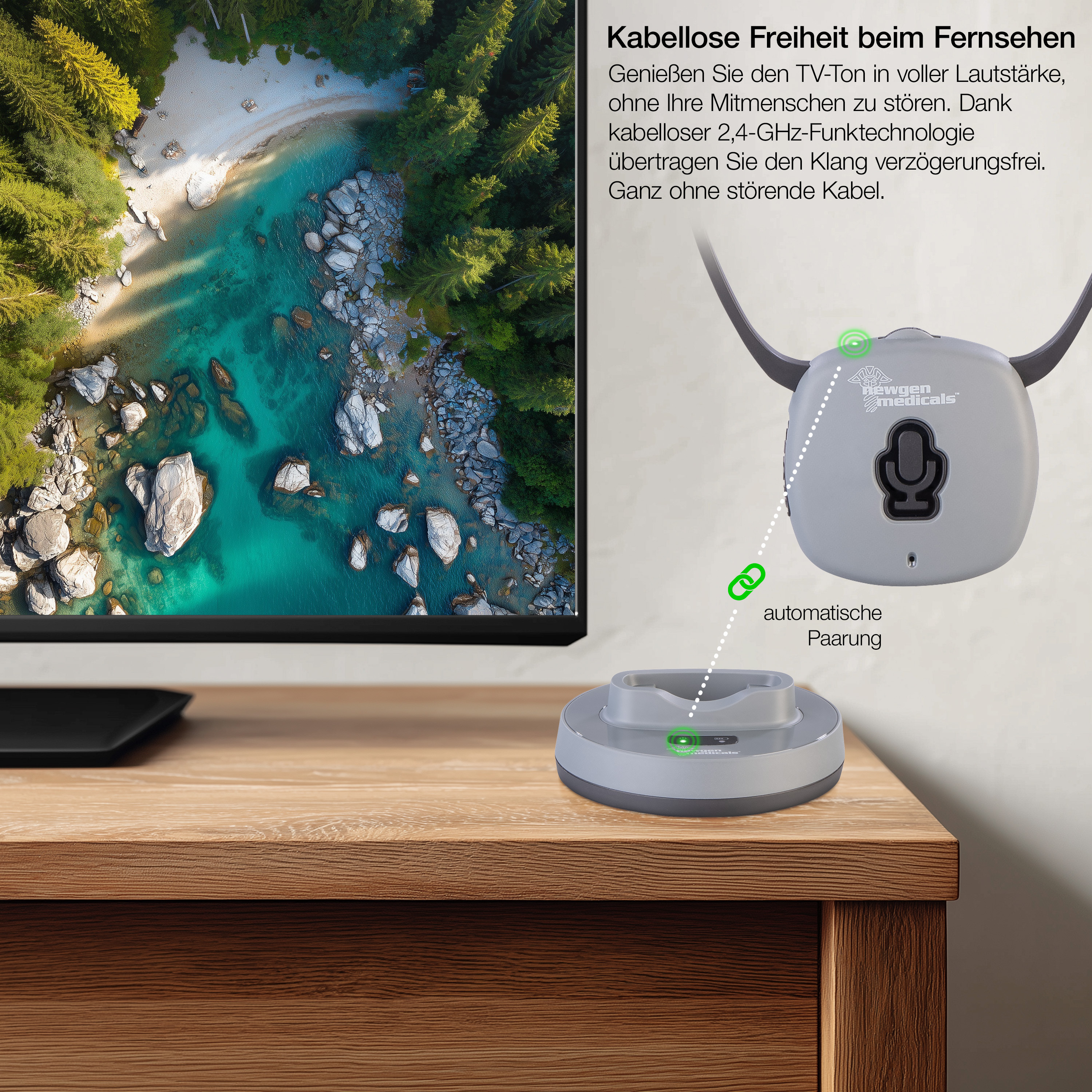 Verzögerungsfreie 2,4-GHz-Funkübertragung: Der kabellose Kinnbügel-TV-Kopfhörer von newgen medicals überträgt den Fernsehton mittels dieser Technologie ohne Verzögerungen und störende Kabelverbindungen. Diese Technologie sorgt für ungestörten Fernsehvergnügen in voller Lautstärke, ohne andere zu stören.