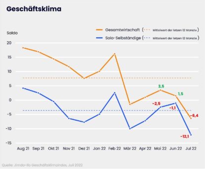 Kleine Unternehmen derzeit besonders hart getroffen: Jimdo-ifo Index auf dem niedrigsten Wert seit Beginn der Erhebung. Der Index der Soloselbstständigen rutscht um 0,7 Punkte auf einen neuen Tiefstwert von -12,8 Punkten. Soloselbstständige bewerten ihre aktuelle Lage deutlich schlechter als die breiter aufgestellte Gesamtwirtschaft. Inflation, Energiepreise, Ukraine-Krieg – diverse Faktoren beeinträchtigen derzeit die Weltwirtschaft massiv. DiesRead more about Für Soloselbstständige und Kleinstunternehmen geht es an die Existenz: Der Jimdo-ifo Geschäftsklimaindex auf dem niedrigsten Wert seit Erhebung[…]